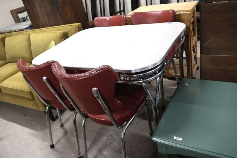 LOT 595 - Retro Chrome and Linoleum Dining Table with Four Chairs and Pop-Up Leaf