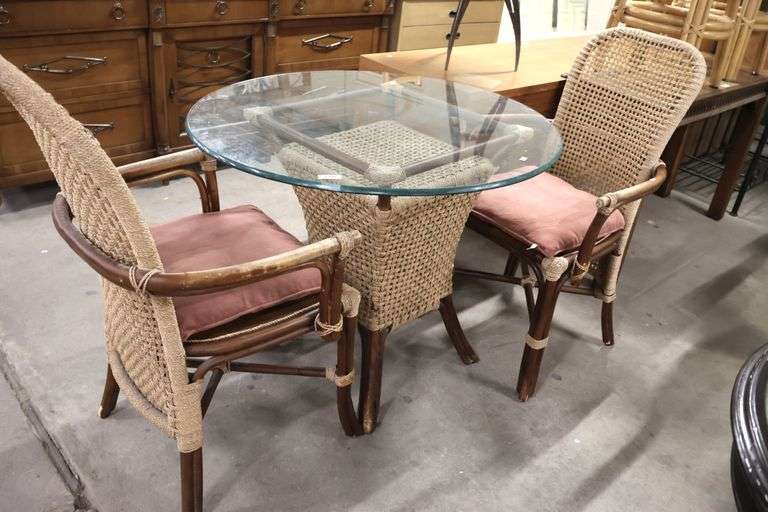 LOT 778 - *NO STORAGE* Glass Top Rattan Table and Two Chairs, As-Is