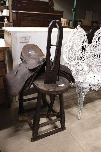 LOT 403 - Antique Saddle Makers Workbench and Leather Saddle