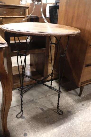 LOT 131 - Antique Wrought Iron and Golden Oak Ice Cream Parlor Table